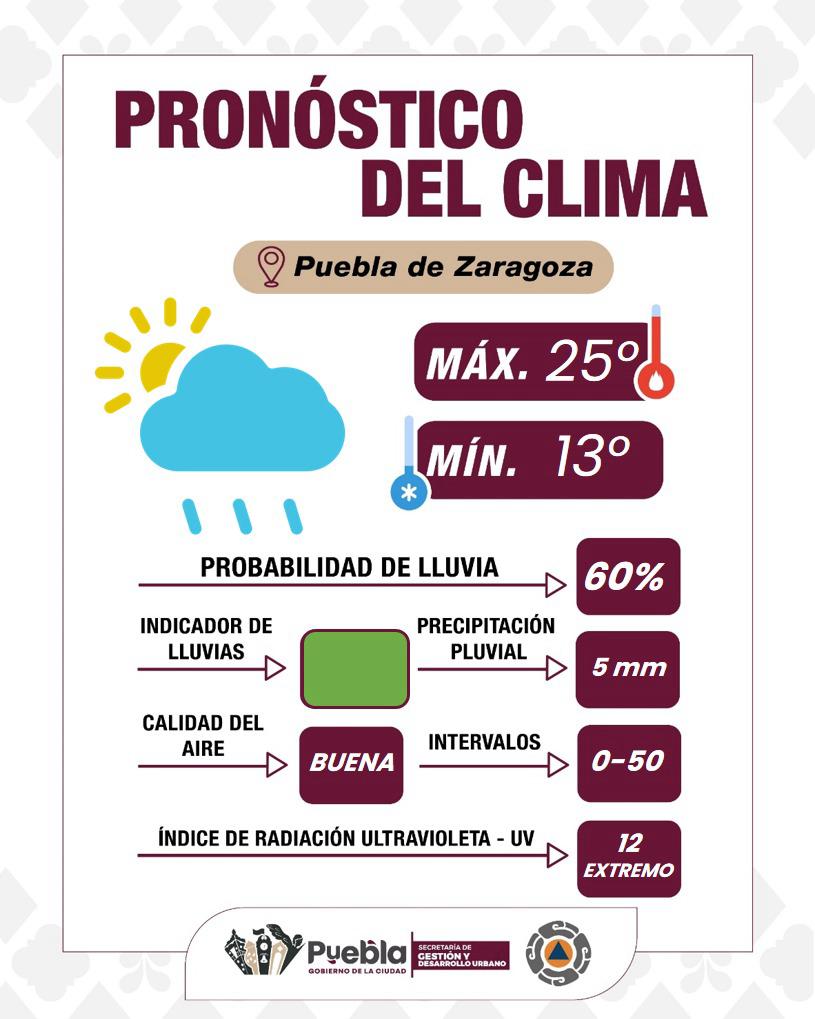 El Gobierno de la Ciudad de Puebla informó sobre el pronóstico del clima para este 7 de septiembre de 2025. Se espera un día parcialmente nublado, con temperaturas que oscilarán entre 13°C y 25°C.