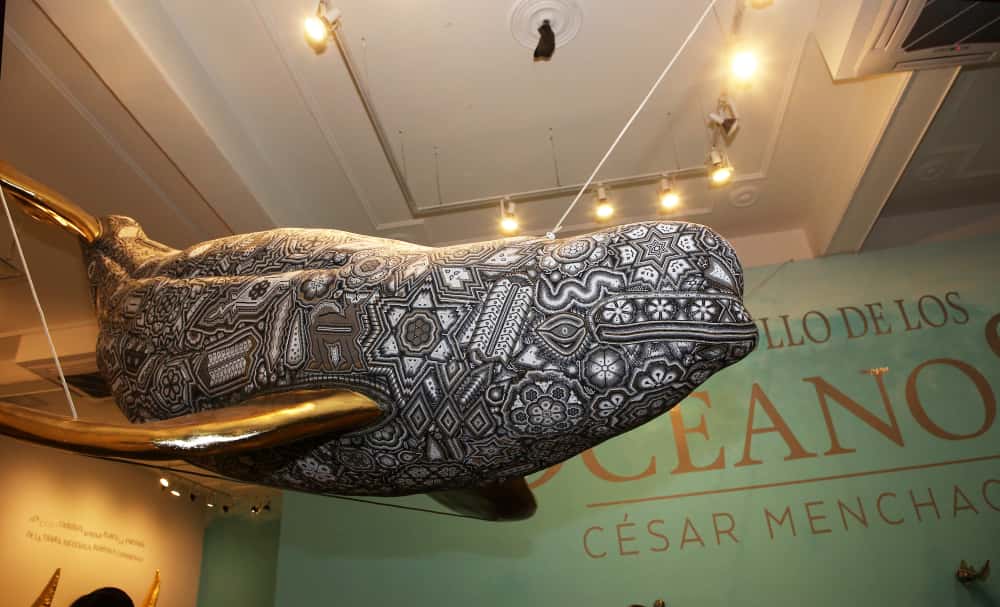 La exposición combina arte huichol y materiales contemporáneos, con esculturas que utilizan chaquira tradicional y plásticos recolectados en playas mexicanas, invitando a la ciudadanía a reflexionar sobre la protección de los océanos y la sostenibilidad ambiental.