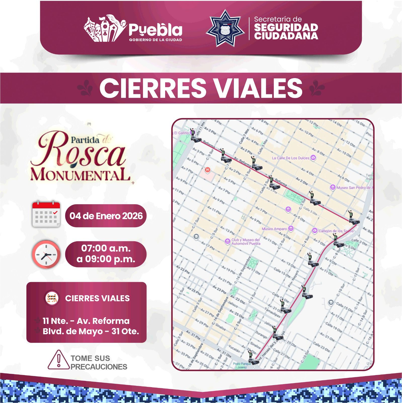 En el Bulevar 5 de Mayo, se restringirá el paso en los carriles central y lateral con sentido a la Fiscalía, extendiéndose hasta la 31 Oriente. La segunda fase iniciará a las 15:00 horas, momento en el cual el cierre será total y absoluto, incluyendo todas las intersecciones del recorrido para permitir el ensamblaje final y la medición técnica de los 6 kilómetros por parte del personal de Récord Guinness.